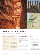 Travel the King’s Way to Madaba to see its famed mosaics including a 6th-cen- tury map of the Holy Land. Savor a home-cooked meal in a century-old home and ascend Mt. Nebo, traditional burial site of Moses. Then visit Dana,