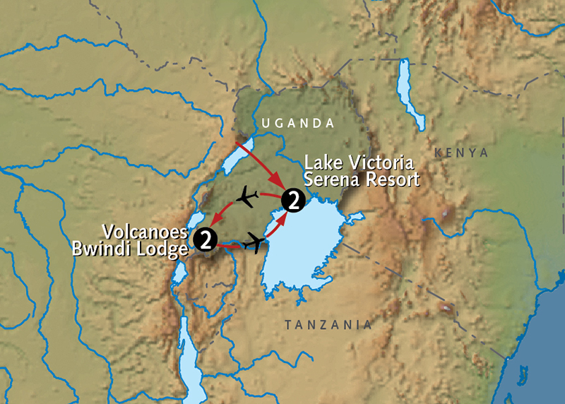 Transfer to the airport for your included flight to Kihihi in southwestern Uganda. Upon arrival, you’ll be met by our expert guide for the overland journey to the evocative Volcanoes Bwindi Lodge, overlooking the magnificent Impenetrable Forest where gorillas, monkeys and chimpanzees roam free in one of Africa’s most biologically diverse areas. After settling in to your comfortable and spacious guestroom, you can explore the grounds of your lodge or visit a nearby village. Meals B,L,D