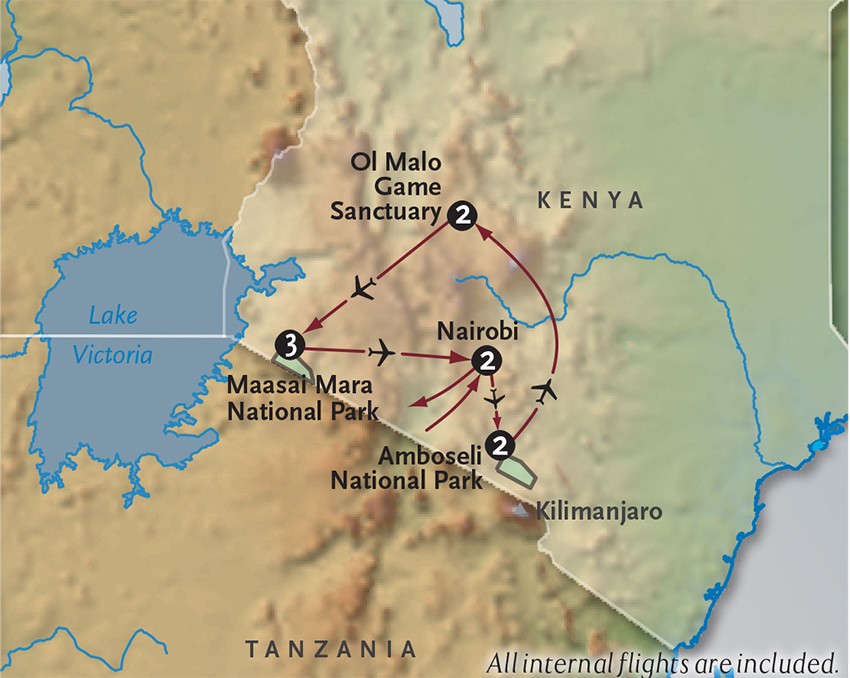 Fly to the family-run Ol Malo Lodge for lunch and an afternoon game drive. On a 5,000-acre private reserve on the edge of Kenya’s isolated Laikipia Plateau, wildlife viewing from our luxury sanctuary includes giraffe, wild dog, leopard, lion, cheetah, hyena, impala, gazelle and buffalo. Meals B,L,D