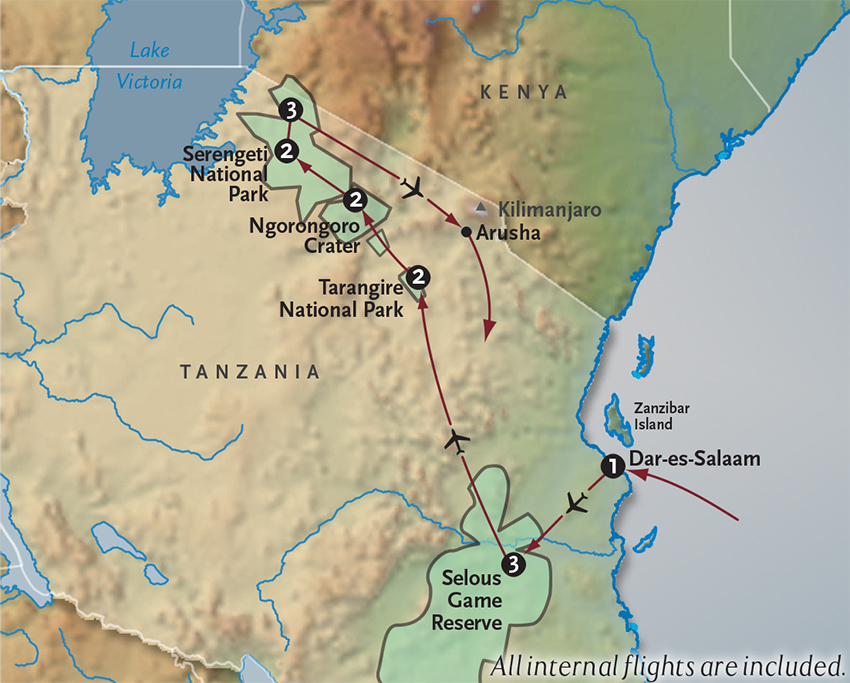 Thrill to breathtaking aerial views as we fly you deep into Africa’s largest reserve for a 3-night stay on the Rufiji River at the exceptional Sand Rivers Camp. Undisturbed by human impact and hailed as one of the Continent’s wildest and most remote reserves, the numbers alone are staggering: 70,000 elephants, 120,000 buffalo, 4,000 lions and 40,000 hippos tell just a part of the story! Over the next 3 days, our safari guides will take you on game drives into pristine areas of the reserve far from other visitors, on wildlife viewing walks deep in the bush, and onto the Rufiji River to navigate through the hippo and crocodile-filled waterways. Meals B+L+D
