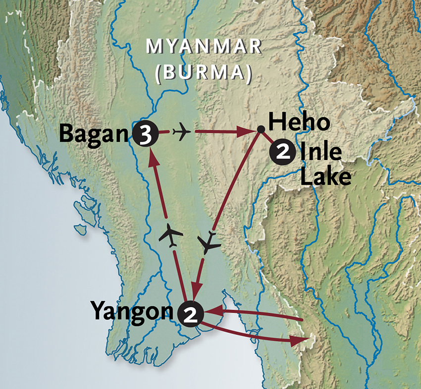 In the afternoon, your private touring continues at Chauk Htat Gyi Pagoda, home to an enormous reclining Buddha statue that stretches more than 200 feet in length. Enjoy a pleasant guided stroll in Kandawgyi Park, set on the shores of a city lake. As the sun dips toward the horizon, you’ll see the illuminated stupa of the imposing Shwedagon Pagoda. Come evening, you’ll visit this venerated landmark. Founded more than 2,500 years ago, Shwedagon Pagoda soars more than 320 feet above the green cityscape of Yangon and its jewel-encrusted golden stupa is testament to the strong Buddhist faith of the country. With darkness descending, this is a moving and tranquil time to be here as you join city residents lighting hundreds of small candles at the base of the Pagoda – an evocative and timeless ritual that takes place nightly here at Shwedagon. Meals B+L