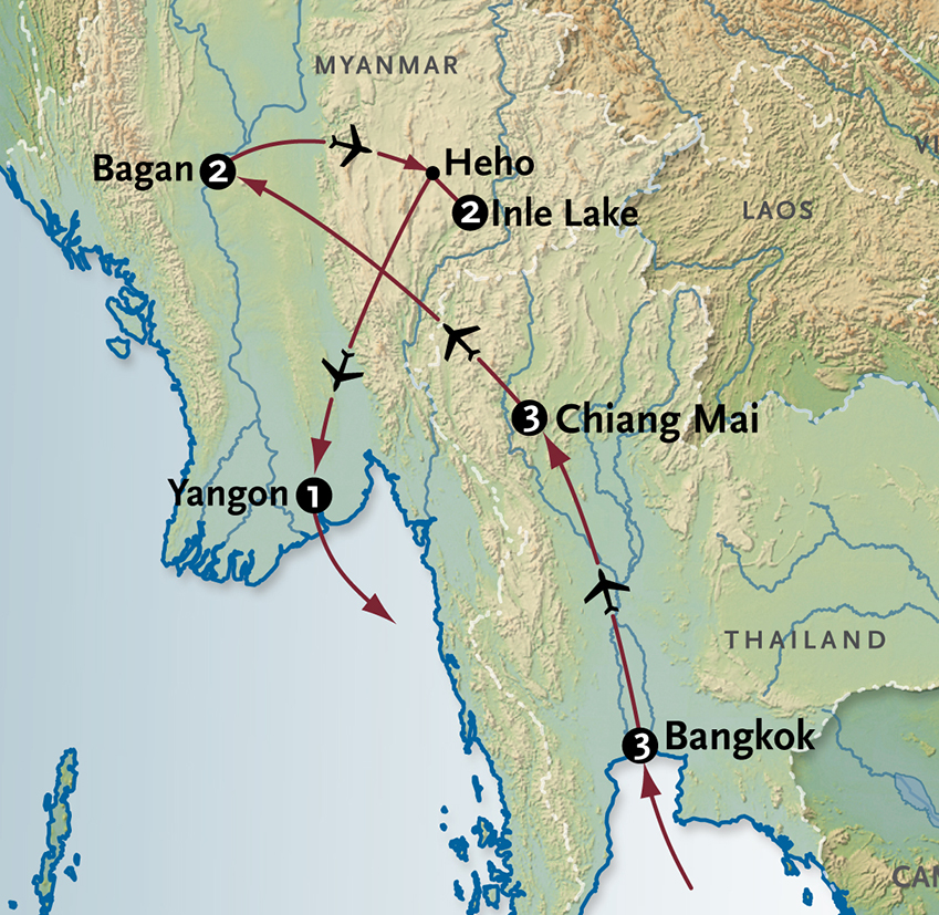 Amidst ancient pagodas, Yangon’s splendid Colonial buildings evoke the spirit of Burma’s British legacy and today’s sightseeing reveals both realms, including Scott Market and the Shwedagon Pagoda, glittering with gold leaf and 8,000 diamonds, rubies and sapphires! Dine this evening at the elegant Strand Grill and spend the night at the historic Strand Hotel. Meals B+L+D