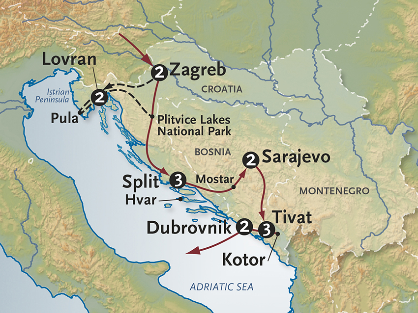 Hailed as the “Pearl of the Adriatic,” Dubrovnik was an important Mediterranean sea power from the 13th century onwards. Although heavily damaged by an earthquake in 1667 and again during the 1990’s by armed conflict, the city has been meticulously restored. Today it is one of Europe’s most beautifully preserved walled cities and it boasts a wealth of Gothic, Renaissance and Baroque churches, monasteries, palaces and fountains. With a prime location near the medieval city gate, our deluxe hotel makes it easy for you to step out and explore this celebrated gem at your own pace. In addition to exploring the architectural monuments that grace the cobblestone lanes of the Old Town, you’ll want take some time to enjoy its galleries, boutiques, cafes and restaurants! This evening, you’ll gather again with your fellow travelers for a congenial farewell dinner. Meals B+D