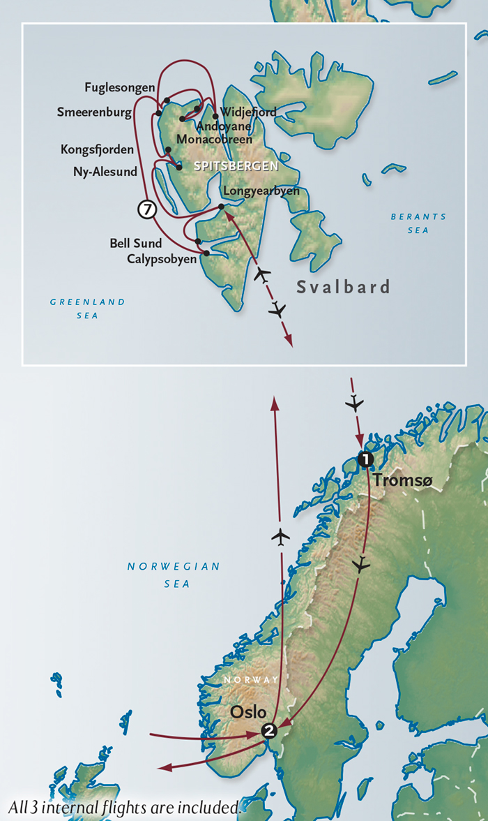 Going ashore on the so-called Blomstrand Peninsula, we’ll nd that it is now an island – the result of a receding glacier. A hike up the 1,263-foot peak of Irgensellet is rewarded with a view of rugged mountains, icy seas and the Kongs Glacier. Later, if conditions permit, a Zodiac excursion will show you the impressive curved face of the Lilliehöök Glacier. Meals B+L+D
