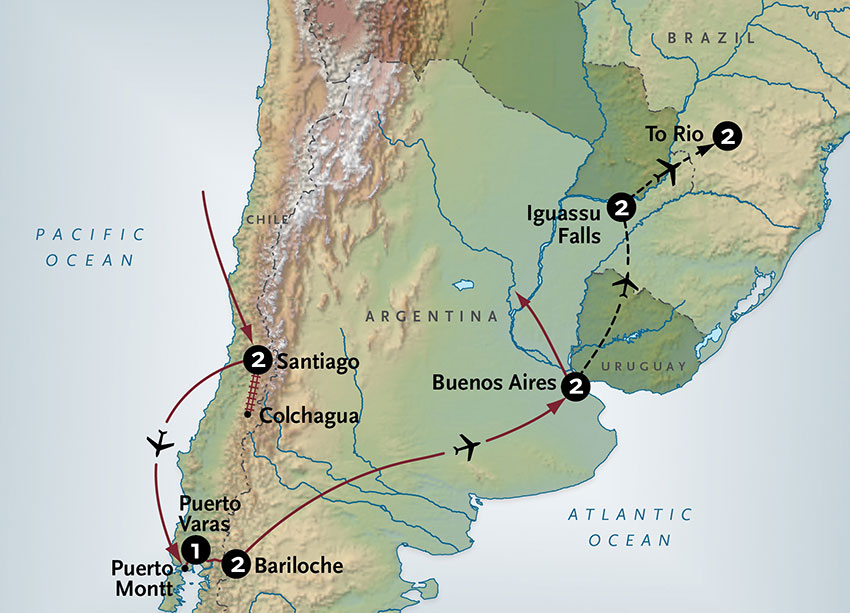 Your day begins in Argentina’s oldest national park, dominated by the Tronador Volcano. Nearby, the forested eninsulas and bays of Lake Nahuel Huapi rank among the loveliest spots on Earth. Your touring takes you up the Campanario Chairlift for views over the deep forests, mountains and lakes. End your morning on a sweet note as you watch the creation of Bariloche’s well-known specialty, chocolate! meals b