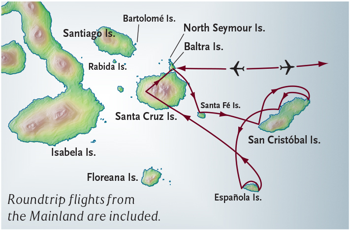 The Galapagos archipelago consists of 13 major islands, 17 smaller islands and more than 40 rocks which are more-or-less permanently above the ocean surface, but Galapagos National Park rules limit visitors to 54 sites. These landing sites were carefully selected to minimize the impact of tourism throughout the Galapagos while still providing visitors with a fascinating overview of the islands’ unique flora, fauna and geology. Visitors must always be accompanied by a licensed naturalist guide and group sizes at some sites are limited by Park Service rules. Traveling aboard La Pinta, your island landings will be in groups of no more than 16 people.