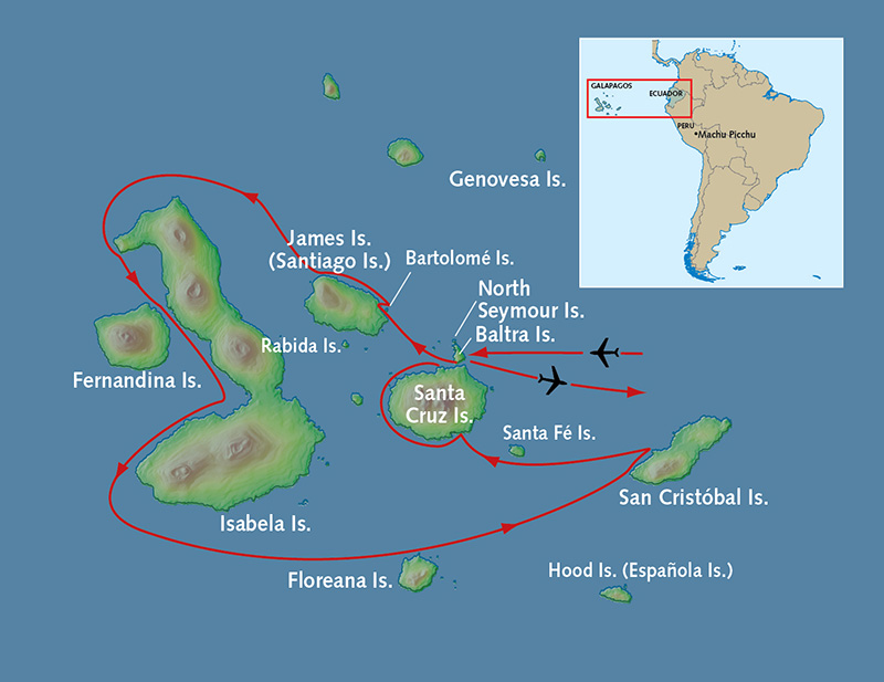 Transfer to the airport for your included flight to Baltra Island where your deluxe ship awaits. This afternoon, explore Sullivan Bay on Santiago Island. A 2-hour guided walk along the beach and over lava fields is a chance to espy lava lizards, Galapagos penguins and numerous bird species. Dinner is followed by the first of your nightly briefings from the ship’s well-informed naturalists. Meals B,L,D