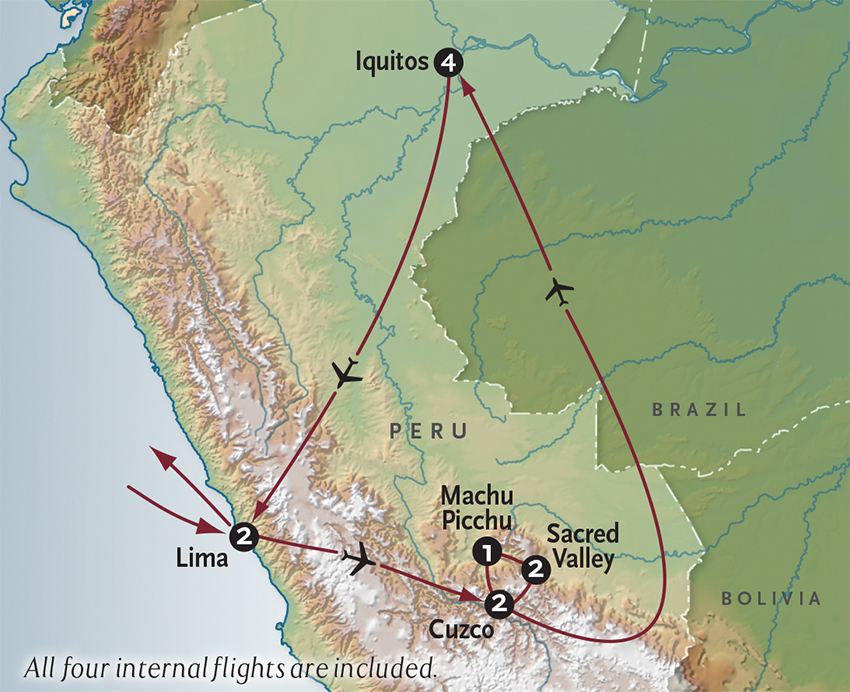 High Water Season - Nov to May: This morning finds the Aria Amazon deep in the heart of the Pacaya Samiria National Reserve. Here in Peru’s largest protected area, we’ll discover a vast wetland reserve filled with dense vegetation, lakes, palm swamps, and streams. In addition, the lush banks of the Pacaya River are home to great egrets, capuchin monkeys and taricaya turtles. After lunch, our guides will show you how the locals fish for paiche; reaching lengths of 7 feet or more, this native Amazon species is among the largest freshwater fishes in the world! On your afternoon excursion along the Ucayali River, you may find your skiff traveling alongside a local boat laden with bananas destined for the market town of Requena. These waters are also home to the remarkable pink river dolphin – so keep your eyes peeled!
