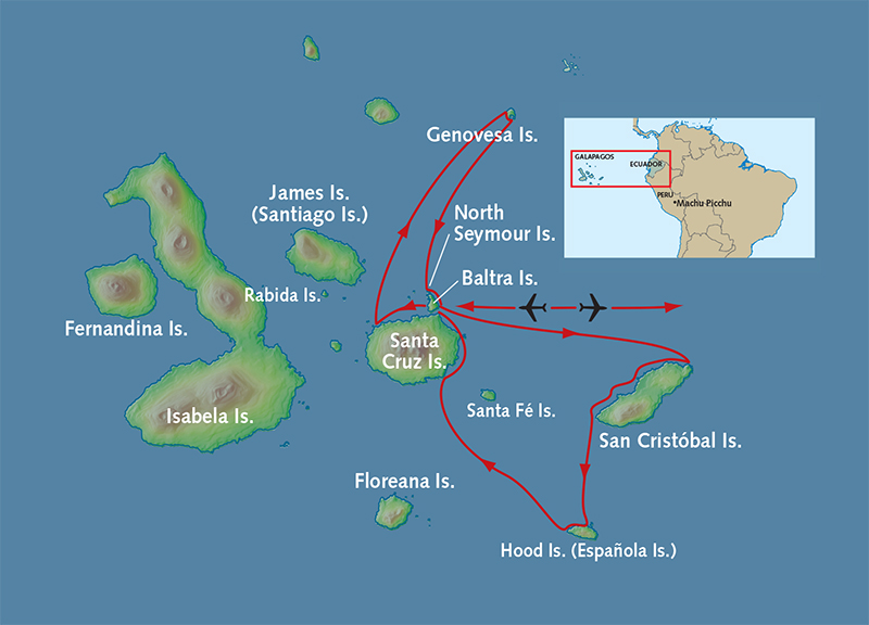This morning’s shore expedition finds you on one of the most volcanically varied islands in the archipelago. After landing on a quiet maroon-colored beach, which takes its distinctive hue from the high iron content of the island’s ancient lava flows, you’ll embark with your naturalist for a guided walk along a short inland trail. Along the way, you can expect to encounter Brown Pelicans nesting in the Salt Brush behind the beach as well as other birds including Galapagos Doves, Yellow Warblers, Pintail Ducks and Flamingos. There’s time to swim and snorkel with the sea lions before returning to the ship. During lunch onboard, your ship will sail to Santa Cruz Island. Depending on landing conditions, you’ll make an afternoon landing at Bahia Ballena (Whale Bay) , the site of one of the oldest former whaling camps in the Galapagos! The Bay’s unusual green-hued beach is due to a high volume of Olivine Crystals. Lead by your sharp-eyed naturalist, your guided walk offers the opportunity to spot marine Iguanas, Galapagos Hawks, Sea Lions and Frigate Birds. Or you’ll sail to Eden Islet for snorkeling, kayaking and zodiac rides. Eden is a small, eroded tuff cone, and an excellent example of the unique geology of the Galapagos Islands. Meals B,L,D