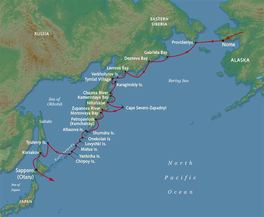 This chain of volcanic islands stretches over 800 miles from the southern tip of the Kamchatka peninsula to the north-easternmost point of Japan, where the archipelago is instead known as the Chishima Islands. As we travel southward, here are some of the places we hope to visit: