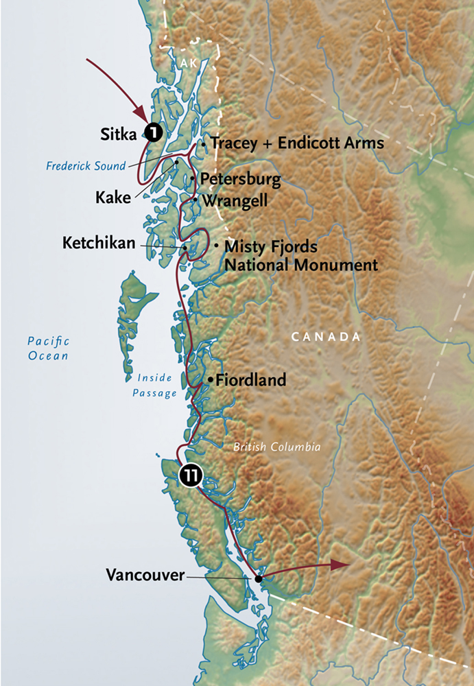 Embark our new, state-of-the-art expedition ship in Vancouver, British Columbia for a 12-day northbound journey to Sitka, Alaska. Including the same ports, sites and activities as our 13-day cruise, this shorter voyage spends one day in the Fords Terror Wilderness, rather than two.